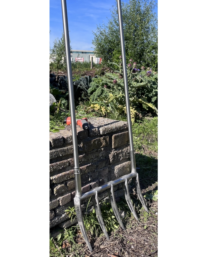 Diese Breitgabel besteht aus hochwertigem Edelstahl, sowohl am Stiel als auch am Blatt. Edelstahl sorgt nicht nur für eine ansprechende Optik, sondern garantiert auch Langlebigkeit und Beständigkeit im täglichen Einsatz. Diese Materialien bieten Schutz vor Rost und anderen äußeren Einflüssen und machen die Grelinette zu einem zuverlässigen Begleiter im Garten.