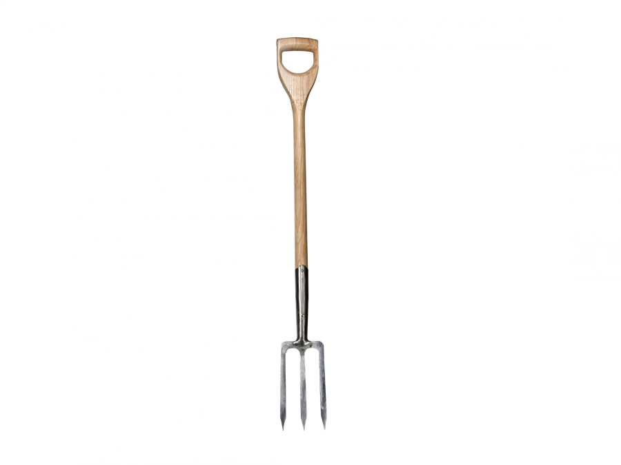 Der Stiel der Grabegabel besteht aus hochwertigem Eschenholz, das für seine Langlebigkeit und seine ansprechende Optik bekannt ist. Die Zinken der Gabel, gefertigt aus feinstem rostfreien Edelstahl, zeigen eine Breite von etwa 13 cm und eine Länge von 23 cm, was ein tiefes Eindringen in den Boden ohne großen Kraftaufwand ermöglicht. Der rostfreie Edelstahl garantiert dabei eine hohe Widerstandsfähigkeit gegen Korrosion und eine lange Lebensdauer des Werkzeugs.