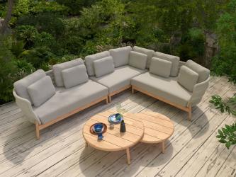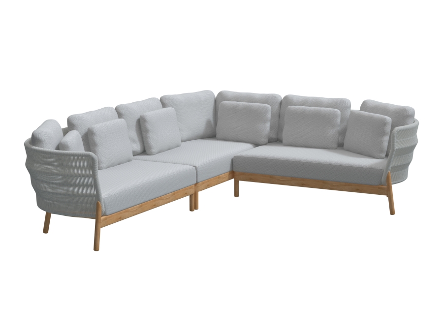 Die 4Seasons Avalon Living-Garnitur zeichnet sich durch ihr massives Teakholzgestell in natürlichem Finish aus, das eine angenehme warme Atmosphäre schafft. Ergänzt wird diese Optik durch die graue Bespannung aus Seil (Rope) und die dazu passenden grauen Polster.