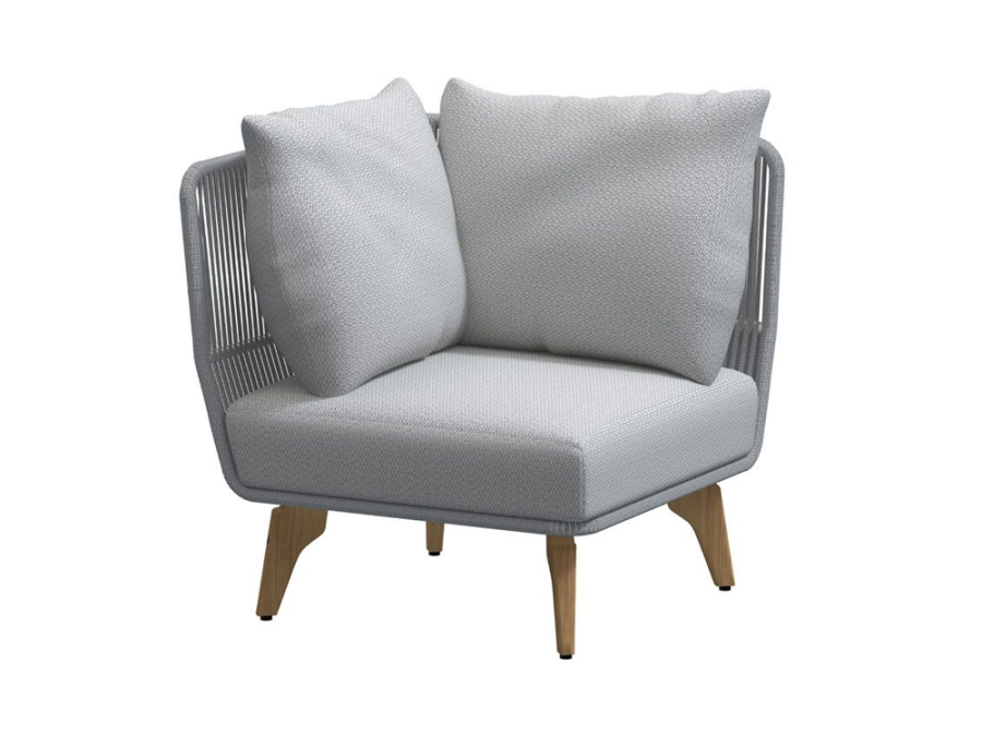 Das 4Seasons Raphael Eckmodul zeichnet sich durch seine einzigartige Kombination aus moderner Ästhetik und hervorragender Verarbeitungsqualität aus. Der hellgraue Kissenbezug, aus 100% Polypropylen, ist nicht nur ästhetisch ansprechend, sondern auch langlebig. Ergänzt wird das Design durch die Armlehnen aus Teakholz, welche perfekt zum Aluminiumgestell und dem gefrorenen Seil (Rope) passen, das in der Bespannung verwendet wird. Diese Komponenten zusammen gewährleisten eine beeindruckende Stabilität und ein unvergleichliches Finish.