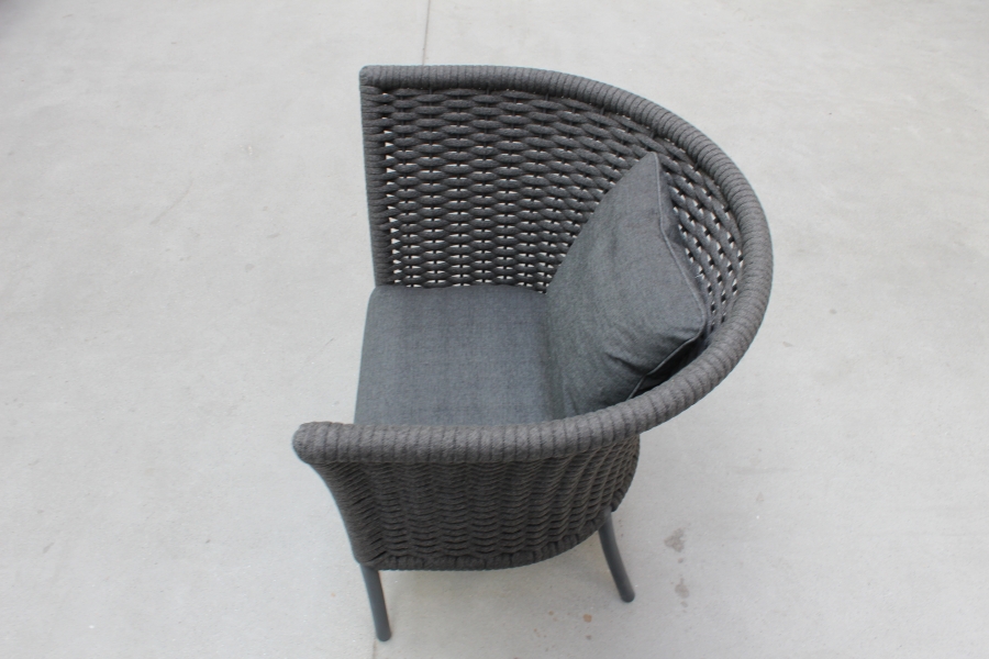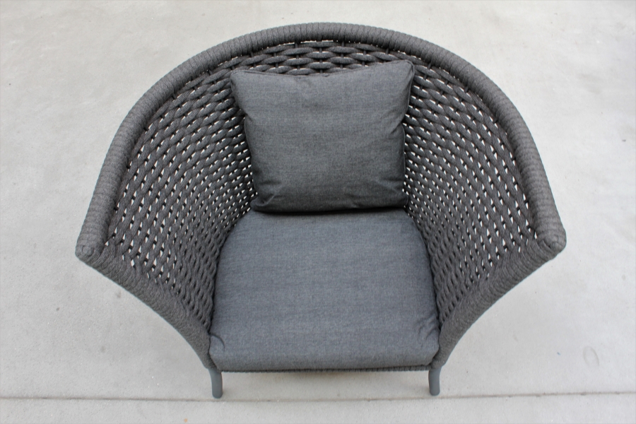Der Loungesessel hat eine edle Bespannung aus Seil (Rope) und ein pulverbeschichtetes Aluminiumgestell. Die Farbe des Gewebes und des Gestells ist ein eleganter Grauton. So fügt sich der Sessel nahtlos in jede Balkon- und Terrassengestaltung ein.