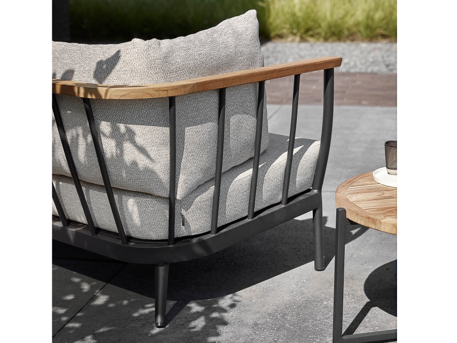 Das Set besteht aus einem pulverbeschichteten Aluminiumgestell in Schwarz, das für seine Robustheit und Langlebigkeit bekannt ist. Die Armlehnen und die Tischplatte sind aus qualitativ hochwertigem Teakholz gefertigt. Die Polster sind in der Farbe Natural Oak gehalten, was dem gesamten Set ein natürliches und warmes Aussehen verleiht.