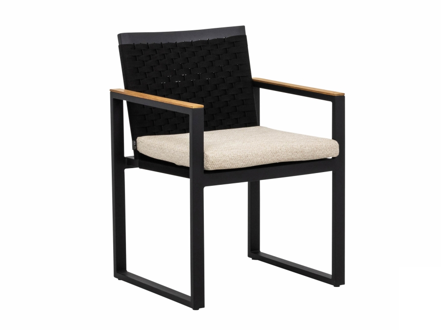 Der Apple Bee Dominica Dining-Sessel präsentiert sich mit einem wasserabweisenden Kissenbezug aus Polypropylen und einem pulverbeschichteten Aluminiumgestell in schwarz, was ihm eine elegante Optik verleiht. Zudem bestehen die Armlehnen aus robustem Teakholz, und die angenehme Polsterfarbe ist Natural Oak.