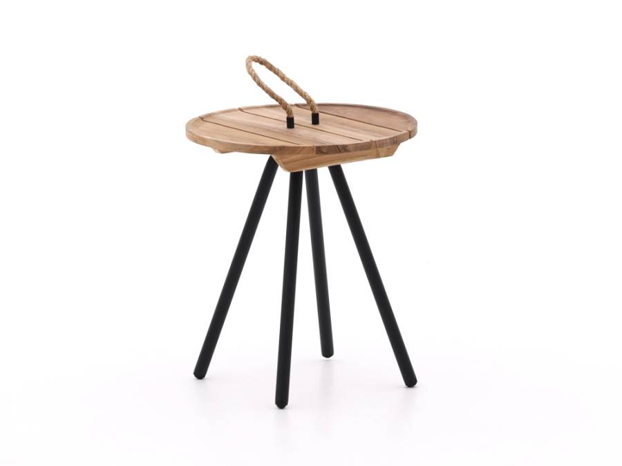 Beim Apple Bee Elle Belt Kaffeetisch-Set sorgt ein stabiles Gestell aus schwarz pulverbeschichtetem Aluminium für eine solide Basis und eine lange Lebensdauer im Außenbereich. Die Pulverbeschichtung schützt das Material vor Korrosion und trägt zu der witterungsbeständigen Qualität des Tisch-Sets bei. Die runden Tischplatten bestehen aus Teakholz, das mit seiner natürlichen Maserung und warmen Farbgebung einen reizvollen Kontrast zum dunklen Gestell bildet. Dieser Materialmix unterstreicht den zeitlosen Charakter des Apple Bee Elle Belt Kaffeetisch-Set und sorgt für seine Pflegeleichtigkeit.