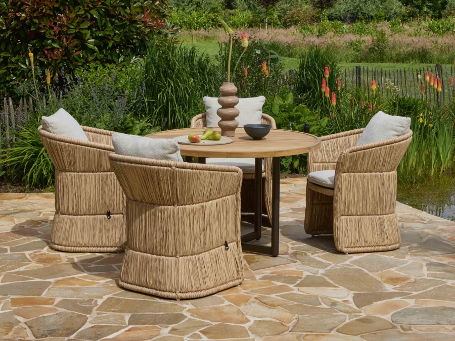 Beim Apple Bee Gili Dining Sessel kommt ein strapazierfähiges Geflecht zum Einsatz, das als Gestell dient und für den dauerhaften Gebrauch im Außenbereich ausgelegt ist. Die Geflechtfarbe Twisted leaf natural sorgt für eine naturnahe, warme Anmutung und lässt den Gartenstuhl optisch leicht wirken. Die Polster sind mit einem Bezug aus ca. 100 % Polypropylen ausgestattet. Die Sitz- und Rückenkissen verfügen über eine Füllung aus Quick Dry Foam, kombiniert mit einem offenen Gewebe an der Unterseite, sodass Feuchtigkeit schnell ablaufen und der Kissenkern zügig trocknen kann. Diese Materialwahl macht den Dining Sessel robust, pflegefreundlich und für den ganzjährigen Outdooreinsatz geeignet.