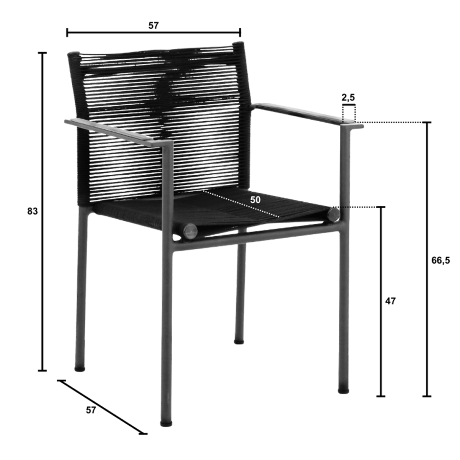 Der Gartenstuhl bietet ausgewogene Proportionen für komfortables Sitzen im Alltag. Die Gesamtbreite beträgt ca. 57 cm, die Gesamttiefe ca. 57 cm und die Gesamthöhe ca. 83 cm. Mit einer Sitzhöhe von ca. 47 cm lässt sich der Apple Bee Jakarta Armlehnstuhl grey sehr gut mit gängigen Esstischen kombinieren, die Armlehnenhöhe von ca. 66,5 cm sorgt für angenehmen Halt beim Sitzen und Aufstehen. Das Eigengewicht von ca. 6,2 kg macht den Armlehnstuhl stabil und dennoch leicht genug, um ihn flexibel im Garten oder auf der Terrasse zu platzieren oder bei Bedarf zu verräumen.