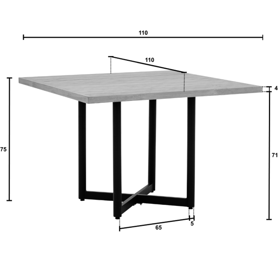 Das Gartenmöbel-Set ist so dimensioniert, dass es ausreichend Platz für vier Personen bietet und sich gut auf der Terrasse integrieren lässt. Die Gesamtbreite und Gesamttiefe der Stellfläche betragen jeweils etwa 224 cm, wobei die Fläche rundum entsprechend größer sein sollte, um Stühle nach hinten schieben zu können, um bequem aufzustehen oder sich hinzusetzen. Der Tisch verfügt über eine Breite von etwa 110 cm und eine Tiefe von etwa 110 cm, die Tischhöhe beträgt circa 75 cm.