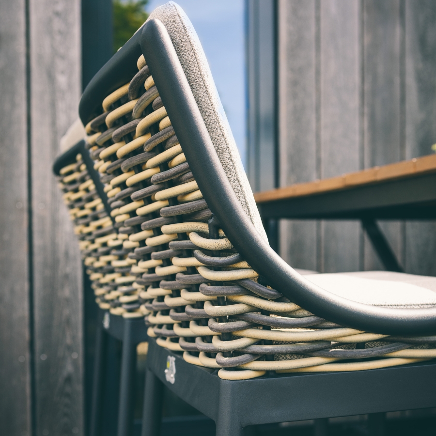 Der Apple Bee Milou Barstuhl Schwarz ist auf hohen Komfort im täglichen Gebrauch ausgelegt. Das mitgelieferte Polster mit einer Kissenstärke von ca. 8 cm sorgt für bequemes Sitzen auch über längere Zeit. Sitz- und Rückenkissen sind mit Quick Dry Foam gefüllt. Diese spezielle Füllung lässt Feuchtigkeit sehr schnell ablaufen und trocknet rasch, was den Barstuhl besonders für den Einsatz im Freien prädestiniert. Das Sitzkissen verfügt über ein offenes Gewebe an der Unterseite, das den Trocknungsprozess zusätzlich beschleunigt. So bleibt der Apple Bee Milou Barstuhl Schwarz auch nach einem Regenschauer schnell wieder einsatzbereit.