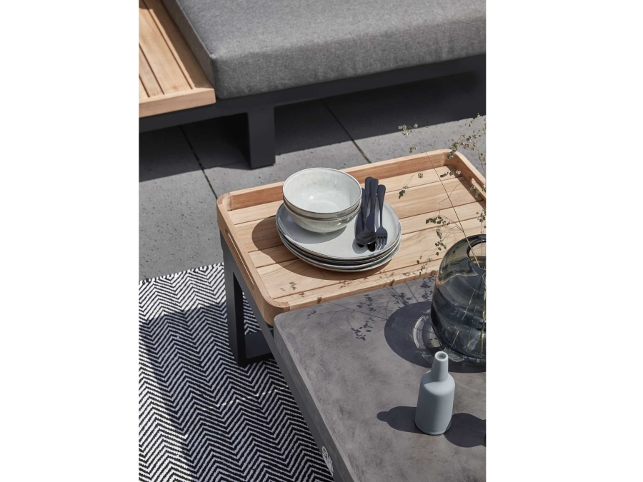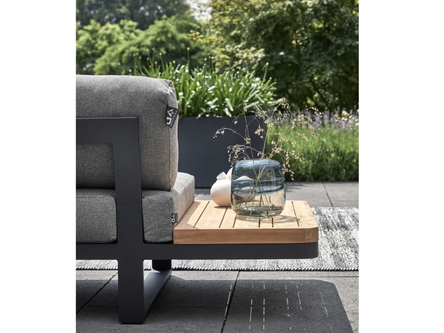 Die Apple Bee Mura Black Loungegarnitur besteht aus einem Loungetisch, einem Sofa mit Ablage rechts, einem Sofa mit Ablage links, sowie einem Sofa mit Armlehne rechts. Diese Bestandteile sind perfekt aufeinander abgestimmt und bilden zusammen eine harmonische Loungemöbel-Landschaft. Die Tabletts aus Teakholz sind nicht fest mit der Tischplatte verbunden und lassen sich auch anderweitig nutzen, was der Kombination eine zusätzliche Funktionalität und Flexibilität verleiht.
