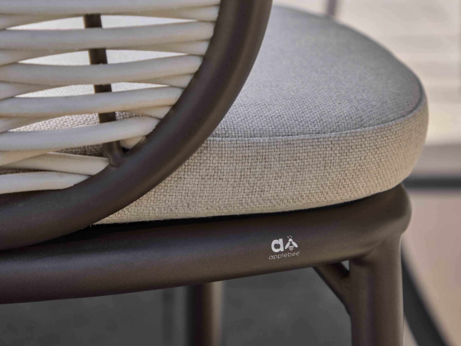 Im Lieferumfang des Apple Bee Pine Key Bronze Dining Armchair sind passende Polster bereits enthalten. Die Kissenstärke beträgt ca. 6 cm und bietet damit einen angenehm weichen Sitzkomfort für längere Aufenthalte im Freien. Die Sitz- und Rückenkissenfüllung besteht aus Quick Dry Foam. Diese spezielle Schaumfüllung zeichnet sich durch eine offene Struktur und eine Kissenfüllung mit offenem Gewebe an der Unterseite aus, sodass eindringende Feuchtigkeit rasch ablaufen und der Schaum schnell wieder trocknen kann. Der Kissenbezug ist wasserabweisend und kann bei Bedarf per Hand mit mildem Waschmittel und einer Bürste gereinigt werden.