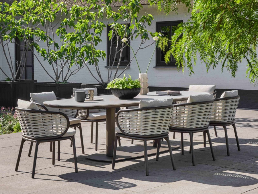 Der Apple Bee Pine Key Bronze Dining Armchair nutzt eine Kombination langlebiger Materialien, die speziell für den Einsatz im Freien ausgelegt sind. Das Gestell besteht aus pulverbeschichtetem Aluminium in der Farbe Bronze. Diese Beschichtung schützt das Material vor Korrosion und trägt zu einer widerstandsfähigen Oberfläche bei. Die Bespannung aus Polyrattan in der Geflechtfarbe Oyster ist pflegeleicht und witterungsbeständig. Die Polster in der Farbe Natur harmonieren optisch mit dem Geflecht und sorgen für einen ruhigen, warmen Gesamteindruck, der sich gut mit weiteren Produkten kombinieren lässt.