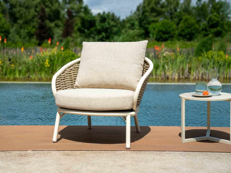 Der Loungesessel Pine Key ist auf ein langlebiges Outdoorleben ausgelegt. Die Bespannung besteht aus hochwertigem Polyrattan, das optisch ein natürliches Geflecht nachbildet und zugleich pflegeleicht sowie witterungsbeständig ist. Das Gestell aus Aluminium ist pulverbeschichtet und damit besonders korrosionsbeständig, stabil und leicht. Die Polster mit der Farbgebung Cotton Flower sind mit einem Kissenbezug aus ca. 100 % Olefin ausgestattet, einem strapazierfähigen Outdoor-Textil mit angenehmer Haptik. Diese Materialkombination ist ideal für den Einsatz im Freien.