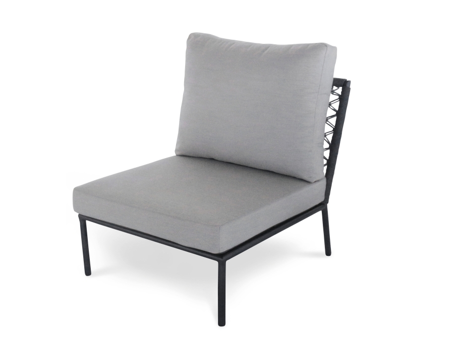 Das Mittelteil verfügt über eine hochwertige Bespannung aus Polyacryl, die sowohl bequem als auch langlebig ist. Auch der Kissenbezug besteht zu 100% aus Polyacryl und harmoniert perfekt mit der grauen Gestell- und Polsterfarbe des Lounge Mittelteils. Dieses Möbelstück ist daher besonders pflegeleicht und haltbarer gegenüber Witterungseinflüssen.