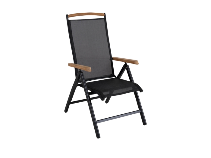 Das Gestell der Essgruppe besteht aus pulverbeschichtetem Aluminium, das ihm sowohl Stabilität als auch Langlebigkeit verleiht. Die schwarzen Armlehnen und Rückenlehnen sind mit hochwertigem Teakholz-Aufsatz veredelt, welches der gesamten Gruppe einen Hauch von Eleganz verleiht. Der anthrazitfarbene Tisch harmoniert perfekt mit dem restlichen Design.