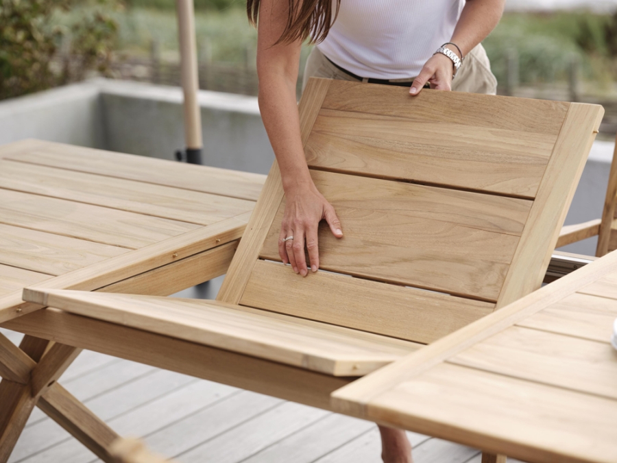 Durch das verwendete Teakholz ist der Brafab Brutus Ausziehtisch von Natur aus besonders wetterbeständig. Das Holz ist gegenüber Feuchtigkeit, Temperaturschwankungen und üblichen Witterungseinflüssen gut gerüstet. Mit einer geeigneten, regelmäßigen Pflege kann die natürliche Farbe länger bewahrt oder auf Wunsch gezielt eine gleichmäßige Patina gefördert werden. Die glatte Oberfläche lässt sich leicht reinigen, sodass der Gartentisch im Alltag nur wenig Aufwand erfordert und dennoch dauerhaft ansprechend bleibt.