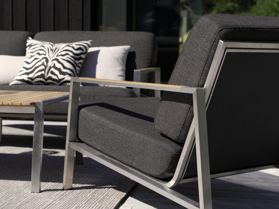 Der Brafab Naos Loungesessel wird inklusive passender, wasserabweisender Auflagen geliefert, die mit einer TPU-Beschichtung ausgestattet sind und dadurch besonders unempfindlich gegen Feuchtigkeit sind. Im Lieferumfang enthalten sind die komfortablen Polster sowie die formschön integrierten Armlehnen mit Teakholz-Elementen. Durch die Kombination aus Edelstahl-Gestell, Textil-Bespannung und Polypropylen-Kissenbezügen entsteht ein durchdachtes Outdoor-Möbel, das auf Langlebigkeit und Alltagstauglichkeit ausgelegt ist. In Verbindung mit dem optional erhältlichen Brafab Naos Loungetisch lässt sich eine stimmige Loungegruppe aufbauen, die sich optisch perfekt in die Gartenmöbel der Serie Naos einfügt.