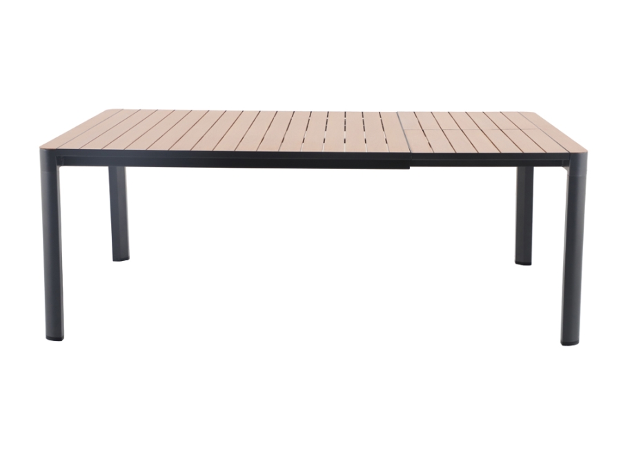 Das Gestell des Tisches besteht aus langlebigem Aluminium. Die Oberfläche ist Elotherm® beschichtet und schützt den Tisch vor den Elementen. Die Gestellfarbe in Eisengrau verleiht ihm ein modernes und stilvolles Aussehen. Die Tischplatte aus Aluminium im Holzoptik-Design verbindet die robuste Struktur mit der Ästhetik natürlicher Materialien.