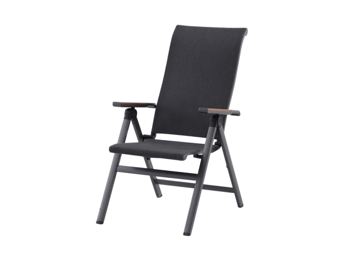 Das Gestell der Prado Serie besteht aus hochwertigem Aluminium, das dank einer speziellen Elotherm®-Beschichtung besonders widerstandsfähig ist. Die Tischplatte besteht aus langlebigem High Pressure Laminate (HPL) in edlem Grau, während die Armlehnen eine ansprechende Mahagoni-Holzoptik aufweisen. Das Gewebe der Bespannung ist aus ca. 100 % Polyester gefertigt und in eleganten Anthrazit-Tönen gehalten. Diese Materialien sorgen für Wetterbeständigkeit und UV-Beständigkeit.