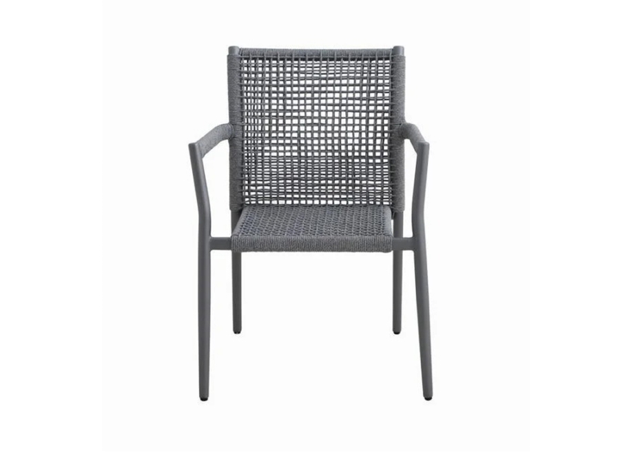 Der MWH Stapelstuhl Ropero besteht aus hochwertigen Materialien. Die Bespannung ist aus robustem Rope gefertigt und in einer eleganten Farbe Anthrazit gehalten. Das Gestell besteht aus langlebigem Aluminium und ist Elotherm®-beschichtet, was dem Stuhl eine extra Schutzschicht verleiht. Die Armlehnen in Holzoptik ergänzen das Gesamtbild stilvoll, während der Polsterbezug aus speziellem Outdoor-Gewebe in einem hellgrauen Farbton gefertigt ist.