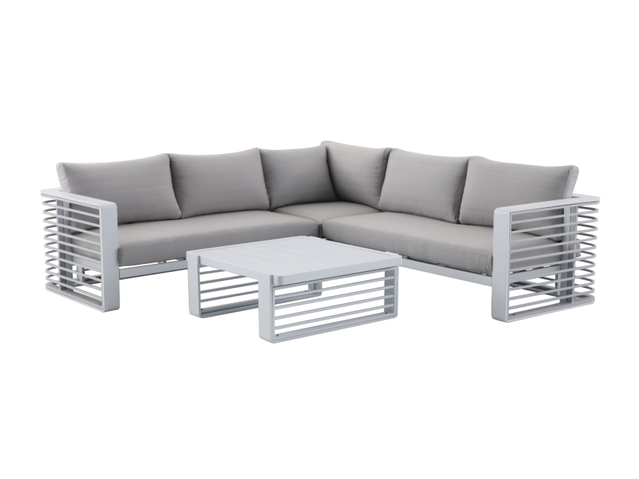 Der Lieferumfang des Royal Garden Bellezza Lounge-Set inkl. Polster 245x245cm umfasst ein Eckteil, zwei 2-Sitzer Sofas und einen Couchtisch. Damit entsteht ein vollwertiges Loungemöbel-Set, das ohne weitere Grundelemente direkt einsatzbereit ist. Im Set sind die passenden Polster bereits enthalten, sodass kein separater Zukauf von Sitz- und Rückenpolstern notwendig ist. Die Polster in der Farbe Frosted Light Grey fügen sich harmonisch in das weiße Gestell ein und sorgen für einen modernen, ruhigen Gesamteindruck. Die Elemente lassen sich mit weiteren Artikeln der Serie Bellezza kombinieren, etwa mit [[Royal Garden Bellezza Hocker]] oder [[Royal Garden Bellezza Dining-Set]], um ein einheitliches Gartenkonzept zu schaffen.