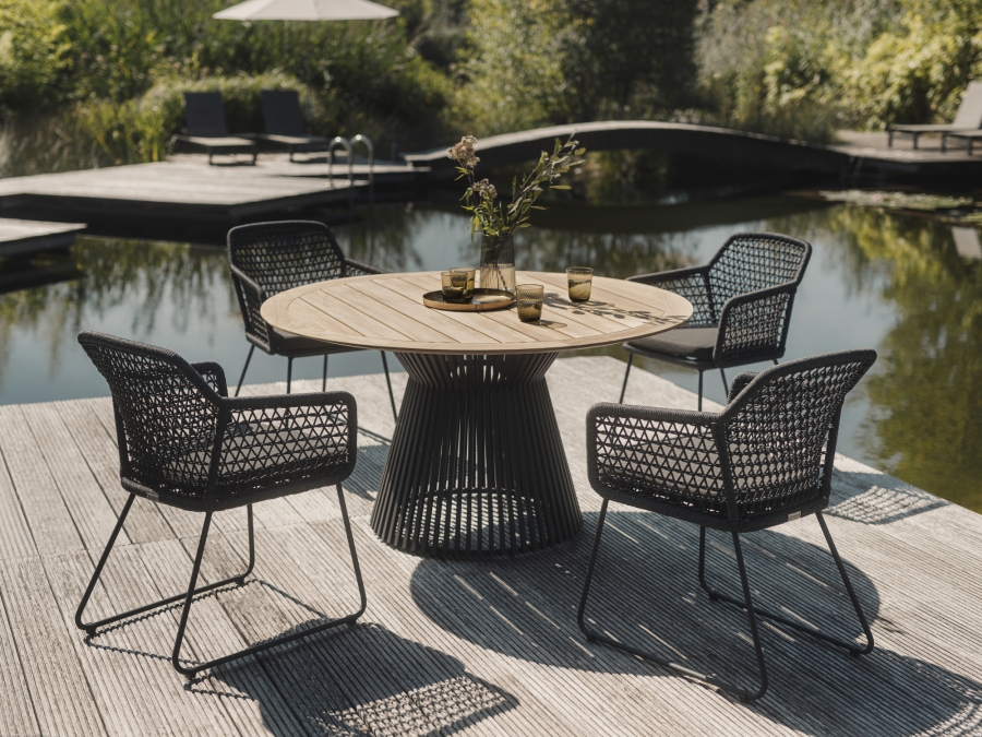 Optisch zeichnet sich das Niehoff Acore-Kubu Esstischgarnitur-Set anthrazit durch ein klares, modernes Design aus. Die Kombination der Serien Kubu und Acore verbindet eine zeitgemäße Linienführung mit einer wohnlichen Flechtoptik. Die Gestellfarbe anthrazit und die Polsterfarbe Southend anthrazit schaffen ein harmonisches Gesamtbild, das sich vielseitig mit weiteren Outdoor-Elementen wie Niehoff Acore-Kubu Detailansicht* kombinieren lässt. Die sichtbare Kordelbespannung verleiht den Stühlen eine luftige Anmutung, während die Teakholz-Tischplatte einen warmen, natürlichen Kontrast setzt.