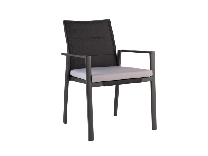 Die Niehoff Gartenmöbel Sitzgruppe Nancer-Nancy 7-teilig überzeugt durch eine sorgfältig aufeinander abgestimmte Materialkombination. Das Gestell der Sessel sowie die Armlehnen bestehen aus pulverbeschichtetem Aluminium in der Farbe anthrazit. Diese Ausführung macht die Konstruktion korrosionsbeständig, robust und zugleich optisch schlank. Die Textil-Bespannung der Sitz- und Rückenflächen besteht aus Batyline-Gewebe mit einem Anteil von ca. 75 % Polychlorid und ca. 25 % Polyester. Dieses technische Gewebe ist besonders pflegeleicht, luftdurchlässig und bietet angenehmen Sitzkomfort. Die Sitzkissen verfügen über einen Kissenbezug aus ca. 100 % Polypropylen, der strapazierfähig und witterungsbeständig ist. Die Tischplatte kombiniert Glas und Keramik in Grau und sorgt so für eine kratzunempfindliche, leicht zu reinigende Oberfläche mit wertiger Anmutung.