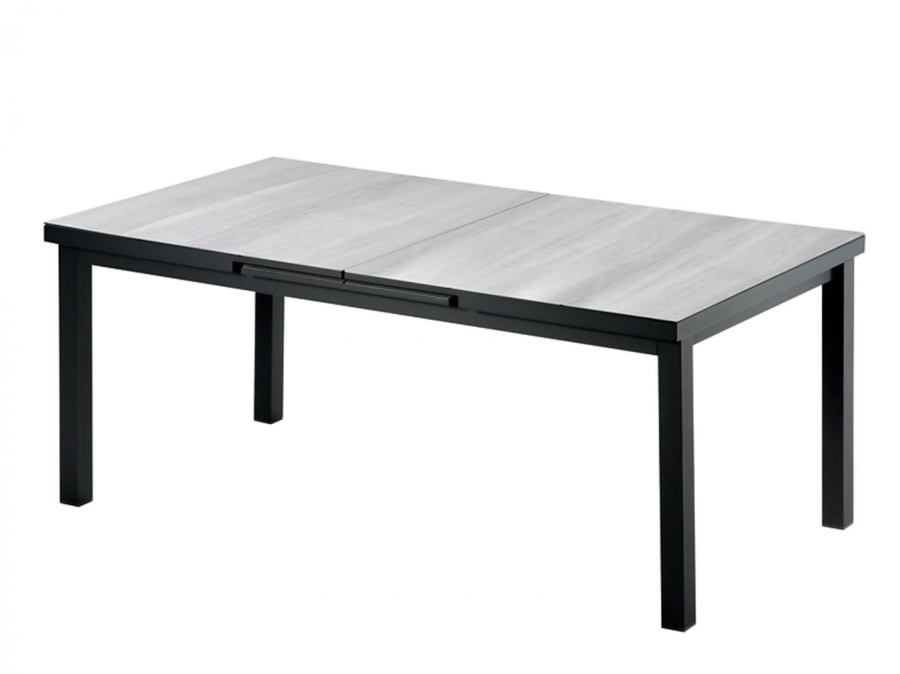 Der Niehoff Nancer Ausziehtisch überzeugt durch eine sorgfältig abgestimmte Materialkombination für den Außenbereich. Das Gestell besteht aus Aluminium und ist pulverbeschichtet, wodurch es besonders widerstandsfähig und pflegeleicht ist. Die Tischplatte setzt sich aus Glas und Keramik zusammen und präsentiert sich in einer Holzoptik mit grauer Farbgebung, die eine natürliche Anmutung mit modernem Stil verbindet. Die dekorative Dekor Tischplatte in Holzoptik sowie die Gestellfarbe Anthrazit verleihen dem Gartentisch einen zeitgemäßen und zugleich dezenten Charakter. Durch die widerstandsfähigen Oberflächen eignet sich der Niehoff Nancer Ausziehtisch besonders für dauerhaften Einsatz im Freien.
