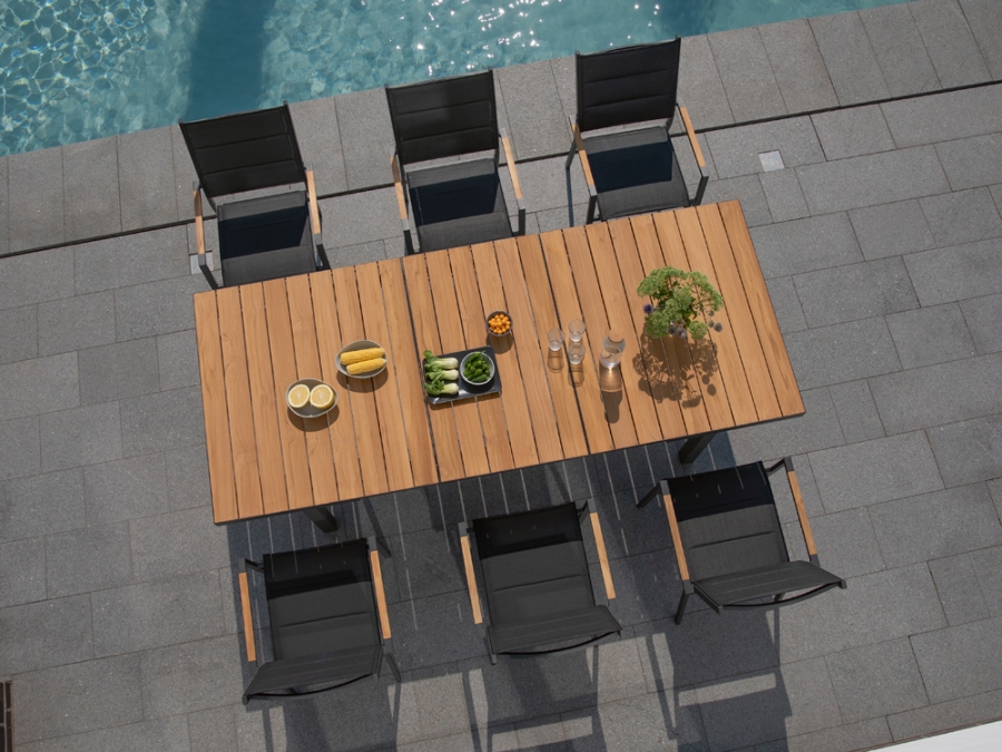 Der im Set enthaltene Ausziehtisch aus der Serie Nantes verfügt über eine Länge von 180 bis 240 cm bei einer Breite von 100 cm und ist damit ideal für gesellige Runden geeignet. Die gebürstete Teakholz-Tischplatte bildet einen warmen Kontrast zum schwarzen Untergestell und passt hervorragend zu weiteren Artikeln wie [[Nantes Stapelsessel]] oder [[Nantes Balkonset]]. Dank der Ausziehfunktion lässt sich die Niehoff Nantes Dining-Sitzgruppe, 7-teilig flexibel an Ihre Gästezahl anpassen und bietet sowohl im Alltag als auch bei besonderen Anlässen ausreichend Tischfläche.