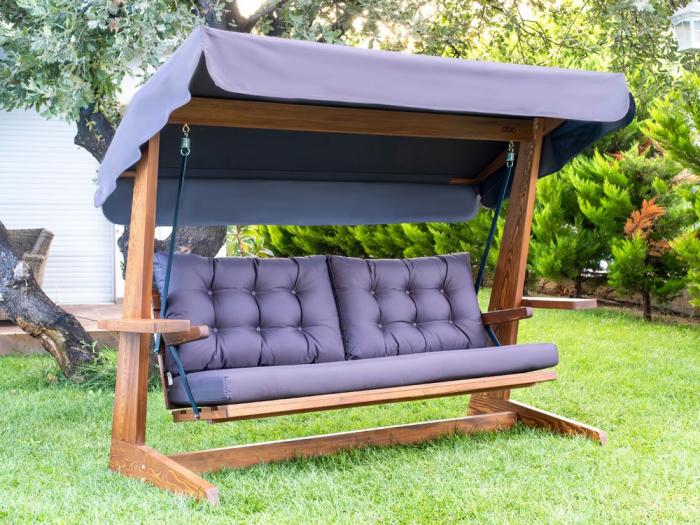 Nicht nur der Ausdruck von Eleganz und Exklusivität, sondern auch das außergewöhnliche Komforterlebnis macht den Charme dieser Hollywoodschaukel aus. Ihr stabiles Gestell aus Fichte und Kiefernholz, in ansprechendem Braunton gehalten, verleiht dem Produkt sowohl die notwendige Stabilität als auch ein attraktives Design. Das Gestell harmoniert perfekt mit der Farbgebung des abnehmbaren, schwenkbaren und UV-Schutz bietenden Sonnendachs, sowie der Polster, die beide aus Outdoor-Gewebe in elegantem Anthrazit gefertigt sind.