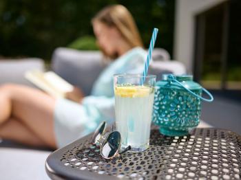 Wie fügt sich der Sieger Samoa Beistelltisch optisch in den Outdoor-Bereich ein?