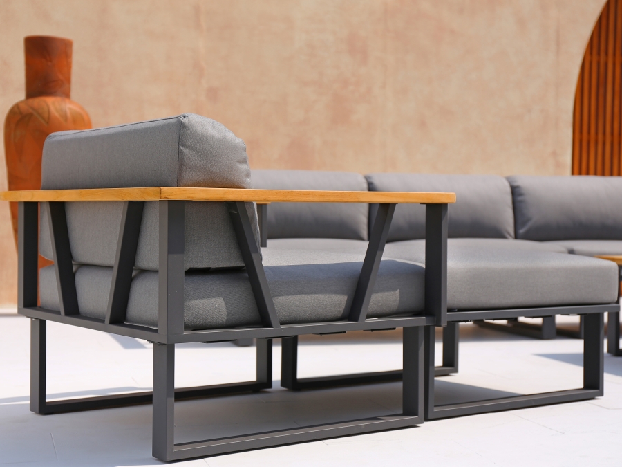 Hergestellt ist das Möbel-Set aus einem pulverbeschichteten Edelstahl-Gestell in der Farbe Graphit. Ein weiteres Highlight ist die Tischplatte aus Teakholz, welches für seine Langlebigkeit und Widerstandsfähigkeit gegenüber Wettereinflüssen bekannt ist. Die im Set enthaltenen Polster bestechen durch ihre Farbe Tweed Grey, die dem Set ein modernes und kühles Aussehen verleiht. Der Kissenbezug besteht aus ca. 100% Polyacryl und ist somit besonders strapazierfähig.