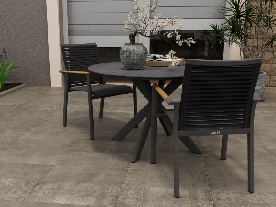 Beim Zebra Tisch Mantis kommt ein robustes Aluminiumgestell zum Einsatz, das pulverbeschichtet ist und dadurch besonders widerstandsfähig gegen Kratzer und Witterungseinflüsse bleibt. Die Gestellfarbe in Graphit sorgt für eine moderne, zeitlose Optik und lässt sich hervorragend mit Gartenstühlen kombinieren. Die Tischplatte besteht aus pflegeleichtem Keramik in der Farbe Shadow, was ihr eine elegante Steinoptik verleiht und zugleich eine hohe Oberflächenhärte sowie Kratzfestigkeit bietet. Durch die Materialkombination aus pulverbeschichtetem Aluminium und Keramik ist der Tisch besonders langlebig und optimal für den dauerhaften Einsatz im Freien geeignet.