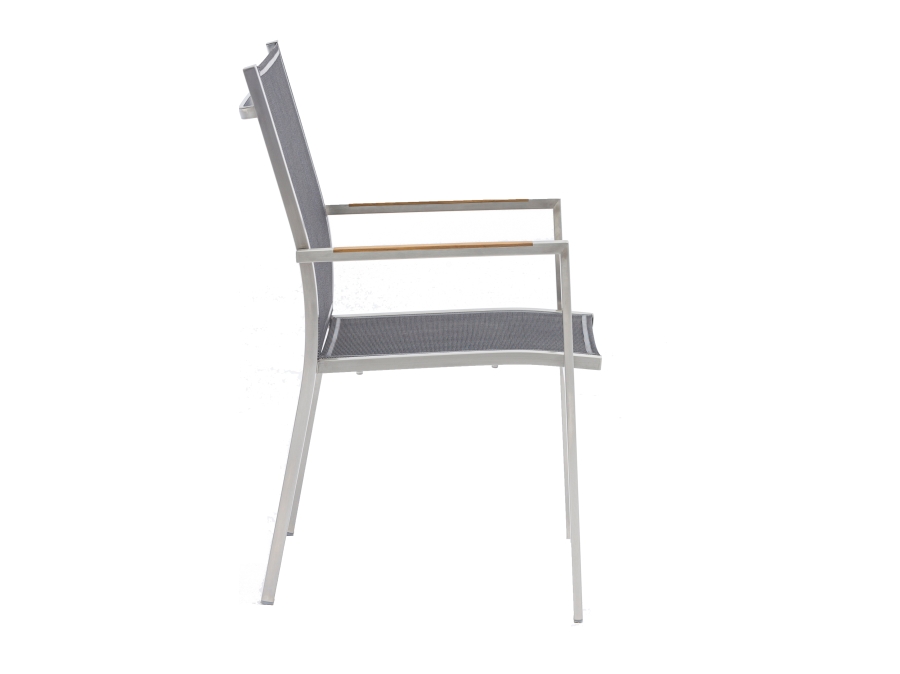 Zebra One Stapelsessel Dark Platinum Edelstahl mit Teak Armlehnen für stilvollen Komfort im Garten