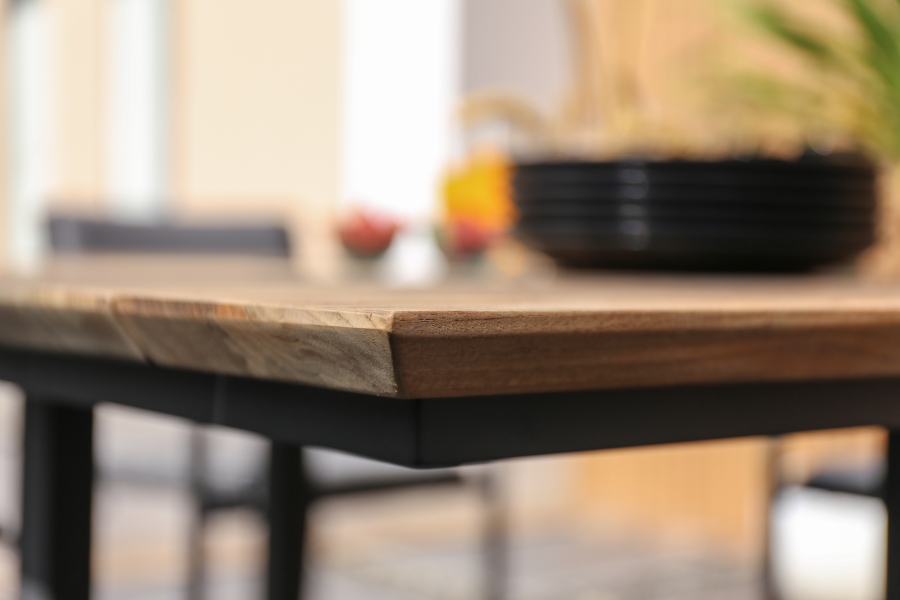 Ein markantes Merkmal des Zebra Tisch Quadux Alu ist die Tischplatte mit Schweizer Kante, also einer nach unten abgeschrägten Kante, die dem Gartentisch eine schlanke, elegante Silhouette verleiht. In der Mitte des Tisches befindet sich eine Aluminiumabdeckung, die das klare Design unterstreicht und gleichzeitig eine funktionale Fläche bietet, beispielsweise in Kombination mit Zubehör. Die harmonische Verbindung von recyceltem Teakholz und dem graphitfarbenen Aluminiumgestell verleiht dem Zebra Tisch Quadux Alu ein modernes, zugleich warmes Erscheinungsbild, das sich in zahlreiche Outdoor-Stilrichtungen einfügt.