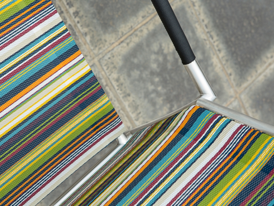 Der Zebra Rovex Stapelsessel green stripe Edelstahl kombiniert ein Rundrohrgestell aus Edelstahl mit einer hochwertigen Bespannung aus kunststoffummanteltem Nylongewebe. Das Twichell Gewebe besteht zu etwa 75 % aus Polyvinylchlorid und zu etwa 25 % aus Polyester. Diese Materialmischung ist auf den dauerhaften Einsatz als Gartenstuhl abgestimmt und bietet eine angenehme Sitzfläche mit guter Luftdurchlässigkeit. Die buntgestreifte Gewebe-Farbe verleiht dem Stuhl eine freundliche Optik und lässt sich gut mit weiteren Outdoormöbeln wie Zebra Naxos Tisch 160x90cm aus recyceltem Teakholz arrangieren.