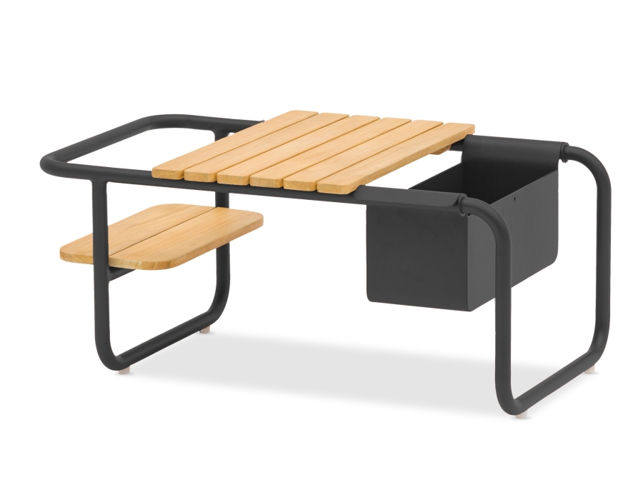 bestehend aus Gestell, Teaktischplatte, Getränkekühlerfach und Teaktablett