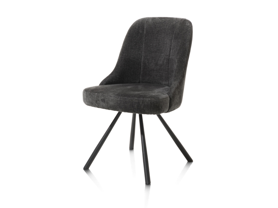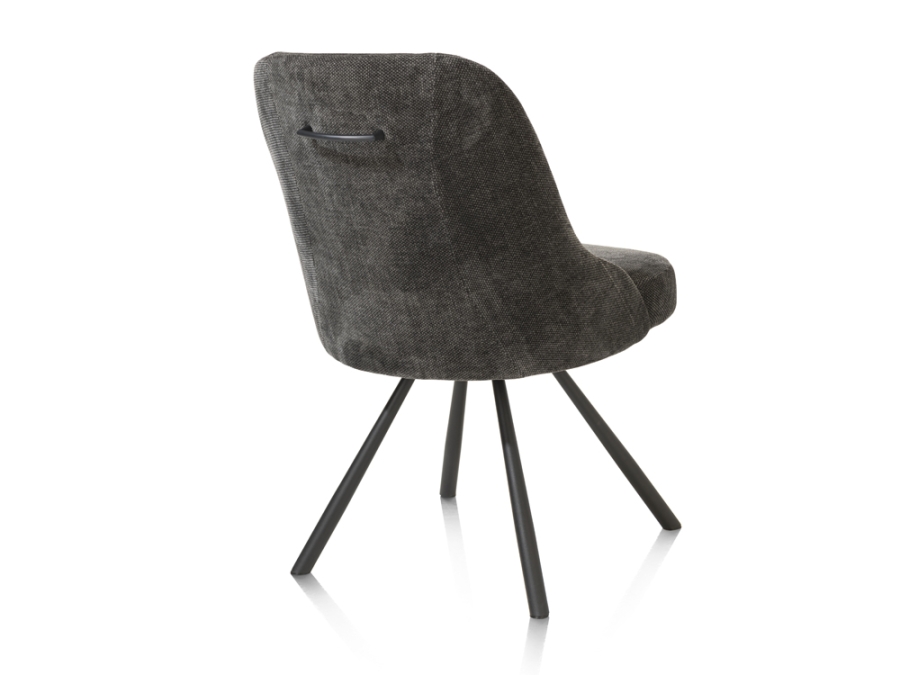 Der Drehstuhl Eva überzeugt mit hochwertigen Materialien. Der komfortable Chenille Polsterbezug in attraktiver Anthrazitfarbe gepaart mit pulverbeschichteten Stahlbeinen in Rough off black Farbe bietet eine harmonische Kombination aus Wärme und Industrie-Chic. Abgerundet wird das Design durch den modischen Griff an der Rückenlehne - ein handliches und stilvolles Detail, das diesem Stuhl eine besondere Note verleiht.