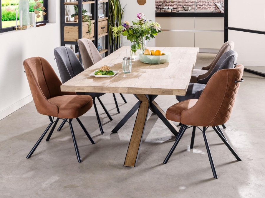 Das charakteristische Metallgestell der Eefje Stühle und das Metallgestell mit Holz-Inlays des Ovada Tisches wurden sorgfältig ausgewählt, um Langlebigkeit und Stabilität zu garantieren. Die Kombination aus Edelstahl und Holz schafft eine moderne, urbane Optik, die in jedem Raum sofort ins Auge fällt. Der Tisch aus furnierter Eiche in railway brown nicht nur robust, sondern bietet auch eine pflegeleichte Oberfläche, die den täglichen Anforderungen des Familienlebens gewachsen ist.