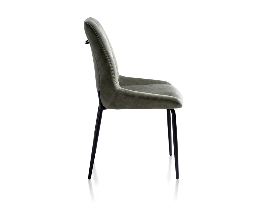 Der robuste Rahmen besteht aus starkem lackierten Stahl in der Farbe Schwarz und hält dem täglichen Gebrauch mühelos stand. Die bequeme Polsterung des Stuhls ist mit einem olivgrünen Stoff namens Karese bezogen. Die Längsnähte auf der Rückenlehne und Ziernähte erzeugen Kontraste und erhöhen das Interesse an der Design-Komposition. Als Zuschlagstoffe im Material wurden Edelstahl und Holz gewählt, was für zusätzliche Haltbarkeit und Festigkeit sorgt.