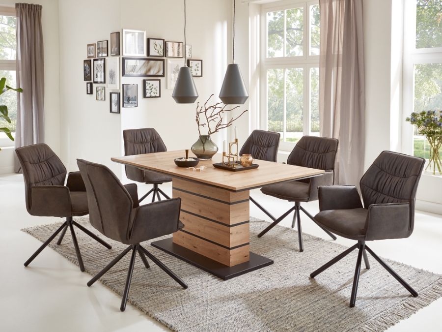 Die Materialien und das aktuelle Design der Sitzgruppe Amado-Tapas vom Hersteller Niehoff machen dieses Produkt so einzigartig. Durch das Artisan Eiche Dekor der Tischplatte und des Säulengestells entsteht eine wunderschöne Maserung. Hinzu kommt, dass die Applikationen im Säulengestell, der Unterleimer der Tischplatte und die Bodenplatte in schwarz gehalten sind. So bildet sich ein reizvoller Kontrast, der das Möbel-Set besonders ausdrucksstark wirken lässt.
