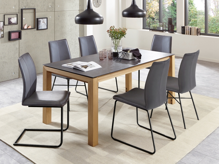 Um den Montana Tisch sind sechs bequeme Stühle aus der Serie Capri platziert. Das Set enthält jeweils 2 Stühle mit Freischwinger-Gestell, 2 Stühle mit Stativgestell und 2 mit Kufengestell. Ihre Gäste können sich auf diese Weise ihre Lieblings-Sitzvariante aussuchen und den Abend in entspannter Wohlfühlatmosphäre genießen.