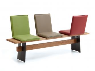 Die Beispielabbildung zeigt die Merlot Designbank und die Sitzschalen Sit mit Lederbzügen in den Farben Apple, Rubin und Stone.