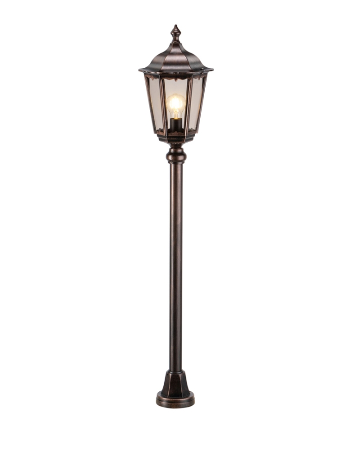 Die Standleuchte ist aus hochwertigem Aluminium-Druckguss gefertigt, was ihr eine hohe Widerstandsfähigkeit gegen Wettereinflüsse und eine lange Lebensdauer sichert. Die eleganten Farbvarianten in Schwarz und Kupfer verleihen der Lampe ein zeitgemäßes Aussehen, während die Glasblende einen klassischen Touch hinzufügt.