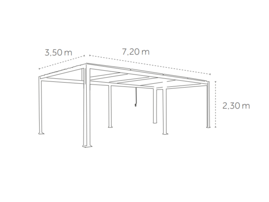 Mit einer Breite von ca. 720 cm, einer Tiefe von ca. 350 cm und einer Höhe von ca. 230 cm bietet die Kiosko Terrassenüberdachung großzügigen Schutz und Komfort für jede Außenfläche. Das Gesamtgewicht beträgt ca. 281 kg, was für zusätzliche Stabilität sorgt. Die robuste Konstruktion wird durch 6 Pfosten mit einer Pfostenstärke von 11,5 x 11,5 cm gesichert.