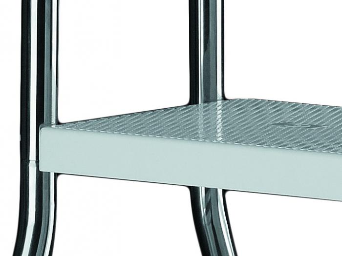 Die Hochbeckenleiter ist aus hochwertigem Edelstahl V2A und ABS-Kunststoff gefertigt und zeugt von Robustheit und Langlebigkeit. Jeder Holm der Leiter, mit einem Durchmesser von ca. 43mm, ist hochglanzpoliert, was ihr ein elegantes Aussehen verleiht