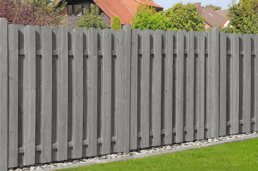 Grau kesselimprägnierter Bohlenzaun als Sichtschutz im Garten.
