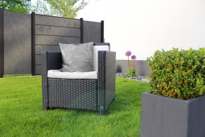 Montagebeispiel Stone Fence Keramik Steckzaun Granit in Kombination mit dem Stone Fence Zaun Granit. Gartenmöbel und Dekoration gehören nicht zum Lieferumfang.