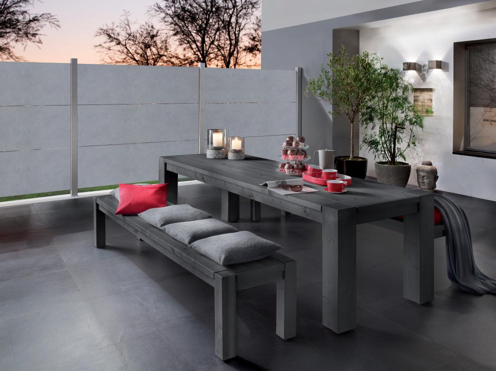 Gestaltungsbeispiel Zaunfeld System Keramik XL Zement. Die Gartenmöbel, der Bodenbelag sowie die Dekoration gehören nicht zum Lieferumfang.