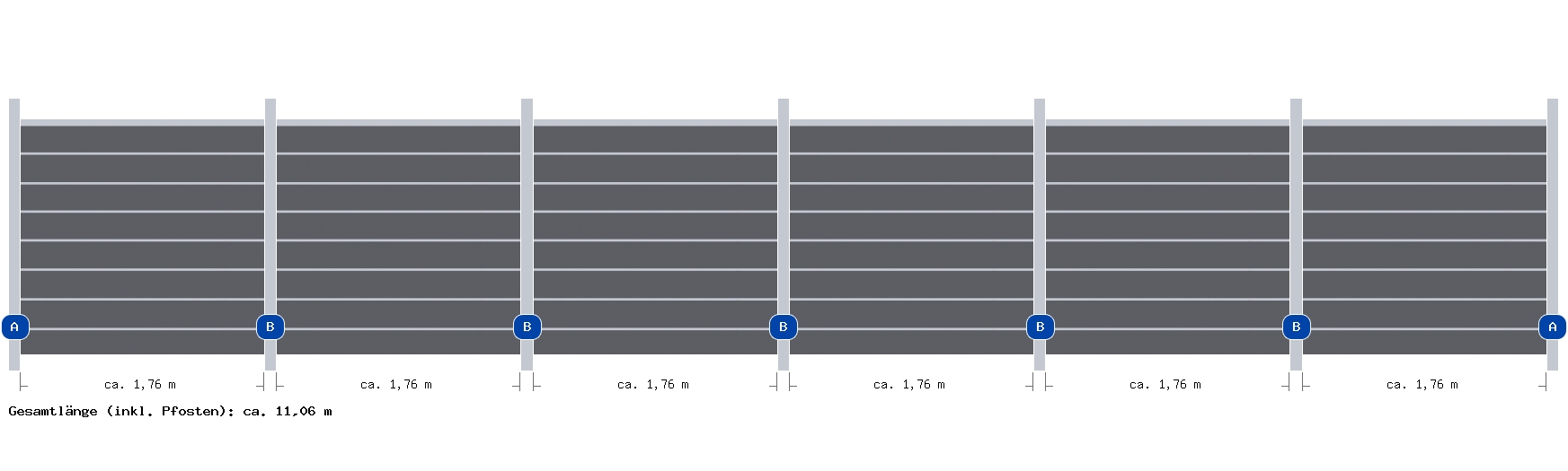 Das Elephant Modular 180 ist für eine Gesamtlänge von ca. 11,06 Metern ausgelegt. Somit bietet es ausreichend Spielraum, um verschiedene Grundstücksgrößen und -formen abzudecken. Die Pfosten sind speziell zum Einbetonieren konzipiert, was eine stabile und sichere Montage gewährleistet.