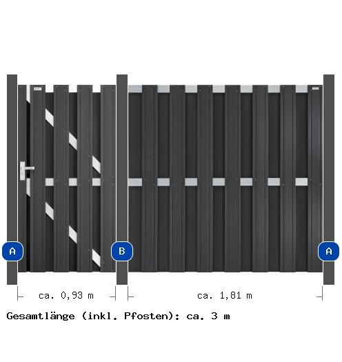 Dieser anthrazitfarbene Zaun fällt aufgrund seiner schlichten Geradlinigkeit und eleganten Erscheinung auf. Mit waagerechten Zaunriegeln aus Aluminium und einer Länge von ca. 400 cm bietet er einen robusten und attraktiven Wind- und Sichtschutz für Ihren Außenbereich. Dank seiner Doppel-V-Nuten-Profile fügt er sich leicht in jede Gartenumgebung ein.